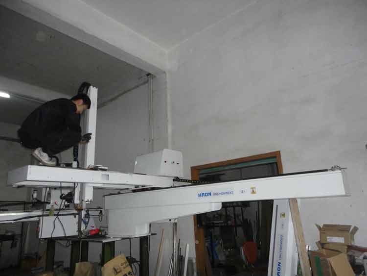 這臺注塑機(jī)是1600噸,配1900或者2000的機(jī)械手型號,安裝后高度太高,只能仰望了、、、