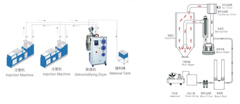 1、把-50℃露點的除濕空氣(單向輸送)不停地送到密填充式真空除濕料桶,將料桶內原材料濕氣吸干。